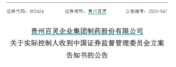 大河财立方消息,12月3日晚间股票配资知识网首选,贵州百灵(002424.SZ)公告,公司实际控制人姜伟近日收到中国证监会立案告知书,因涉嫌内幕交易、信息披露违法、违反限制性规定转让股票,中国证监会决定对其进行立案。